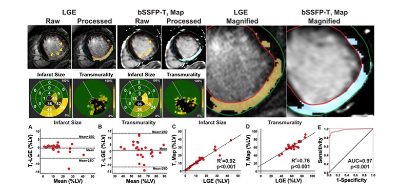 Characterizing Chronic MI in Patients. Typical short-axis LGE images and non-contrast bSSFP-T1 maps from a STEMI patient with chronic MI at 3T are shown. MI (highlighted dark-blue pixels in the processed images) was identified on both LGE images and bSSFP-T1 maps. Bulls-eye plots depicting the size and transmurality of the MI are shown for both LGE and T1. Similar to canines, excellent correlations were observed between LGE images and bSSFP-T1 maps in terms of the location, spatial extent and transmurality of the infarcted myocardium. bSSFP-T1 maps and LGE images were not different for measuring infarct size (p=0.90) and transmurality (p=0.52). Bland-Altman analysis showed excellent agreement between LGE and bSSFP-T1 maps for measuring infarct size (A) and transmurality (B). Excellent correlations were observed between LGE images and b-SSFP T1 maps for infarct size (R2=0.92; C) and transmurality (R2=0.76; D). ROC analysis showed that the area under the curve was 0.96 (E). doi:10.1016/j.jcmg.2015.04.018.