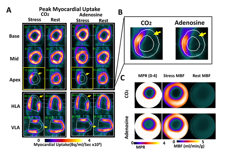 Regional Myocardial Blood Flow Response to Hypercapnia and Adenosine in the Presence of Coronary Stenosis are the Same. Panel A shows representative short- (base, mid, apex) and long-axis (HLA and VLA) PET images of peak myocardial uptake of 13N-ammonia during hypercapnia of PaCO2 ~ 60 mmHg (CO2), standard clinical dose of adenosine (Adenosine), and at rest with PaCO2 ~ 35 mmHg (rest), in a canine with a coronary stenosis of the LAD. Note the differentially lower uptake of the radiotracer in the anterior lateral wall (as evidenced by the lower signal in myocardial segments supplied by the distal LAD; yellow arrows) under hypercapnia and adenosine. For ease of visualization, reduced tracer uptake in the LAD territory during peak uptake in remote regions (i.e., those not impaired by coronary stenosis) is highlighted in the zoomed-in apical short-axis image under hypercapnia and adenosine in Panel B. For the case in Panel A, rest and stress MBF (under hypercapnia and adenosine) and corresponding MPR are shown as polar maps in Panel C. These images show a marked preferential reduction in MBF and MPR in the supply regions of the LAD, which are visually evident and spatially consistent under hypercapnia and adenosine.
