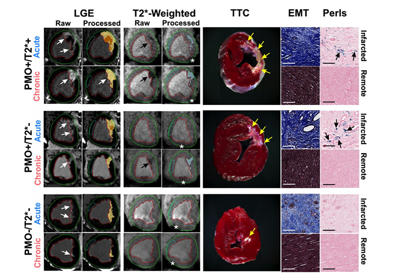 Persistent Microvascular Obstruction in Reperfused Myocardial Infarction Leads to Chronic Iron. Representative in-vivo raw and processed LGE and T2*-weighted images from reperfused canines acquired in both acute and chronic phases post-MI are shown. Arrows point to the sites of MI and iron deposition on LGE and T2*-weighted images, respectively. Corresponding ex-vivo histological sections stained with TTC, EMT and Perls stain are also shown. Scale bars in the microscopic histology images correspond to 50μm. Note the significant chronic iron deposition in the PMO+/T2*– group, despite the absence of acute reperfusion hemorrhage. Perls stain confirmed the presence of chronic iron deposition (blue deposits pointed at by the arrows) in the PMO+/T2*+ and PMO+/T2*– groups, but not in the PMO–/T2*– group. EMT stains showed significant fibrosis in the infarcted territory compared to a very mild diffuse fibrosis in the remote territory, which were not visually evident on LGE. Asterisks in the T2*-weighted images point to the sites of off-resonance artifacts that were manually excluded in the final analysis.