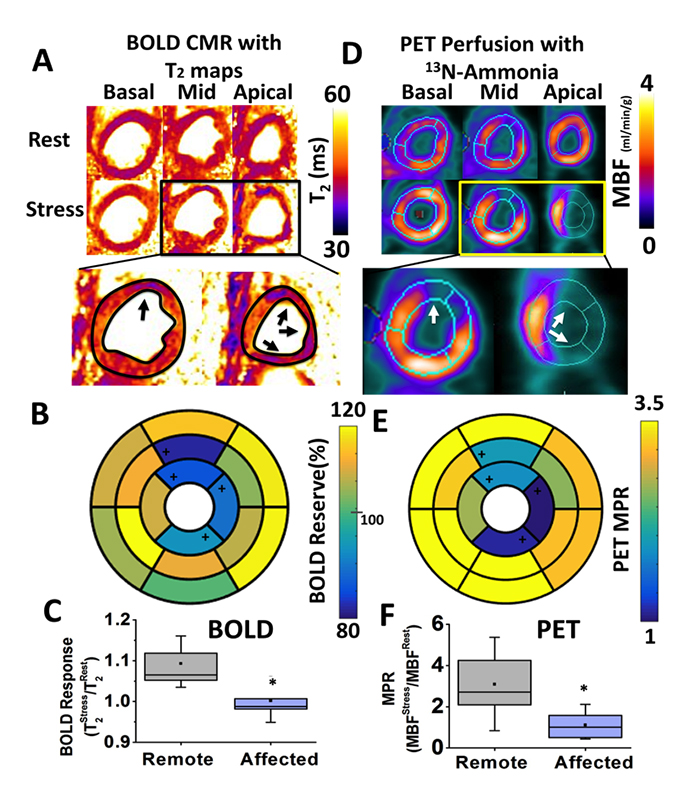 Fast (<5 minutes), Heart-Rate-Independent, Whole-Heart, Free-Breathing, Three-Dimensional Myocardial BOLD MRI at 3T and 13N-ammonia PET at Rest and Under Adenosine Stress in Canines with LAD Coronary Stenosis. Panel A shows representative basal, mid and apical short-axis T2 maps at rest and under stress, from a canine with LAD coronary stenosis. Panel D shows the corresponding quantitative myocardial blood flow (MBF) maps determined from 13N-ammonia PET. Note the close correspondence in the MBF distribution and T2 maps, particularly under adenosine stress. Specifically, the remote territories on PET images showed increased T2 values on T2 maps acquired under adenosine. Conversely, the affected territories on PET images (anterior wall corresponding to LAD territory; white arrows in zoomed-in images) showed markedly diminished increase in T2 (black arrows in zoomed-in images) compared to remote segments. Corresponding polar maps for BOLD and PET are shown in Panels B and E, respectively. Affected segments identified with change analysis from QPET are labeled with ‘+’ in the polar maps. Both BOLD Response and PET MPR showed significantly lower values in the affected territories compared to the remote segments (Panels C and F, respectively).