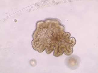 To achieve this, we generate 3-D human intestinal organoids, derived from either induced pluripotent stem cells or intestinal biopsy samples, from both patients and control individuals. These organoids are used to assess how inflammatory cytokines, microbes and an individual’s genetics, can all influence the functioning of the intestinal epithelium. In some instances, these organoids are incorporated in small microengineered chips to facilitate such studies and include the image attached. Please include a caption under the image stating, "Phase contrast image showing three-dimensional human intestinal organoid derived from induced pluripotent stem cells."